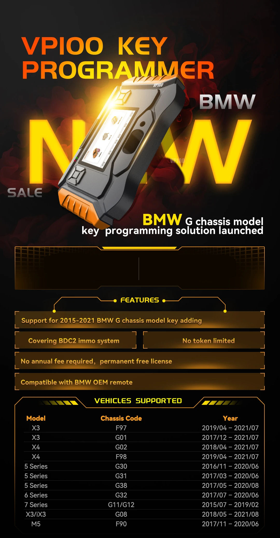 The VP100 is the latest innovation from Vapon, specifically engineered to support for BMW G chassis models from 2015 to 2021. This powerful device brings a range of features designed to make key programming faster, easier, and more cost-effective than ever before.